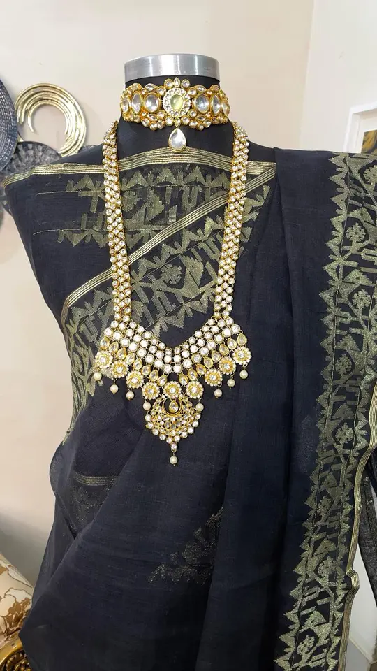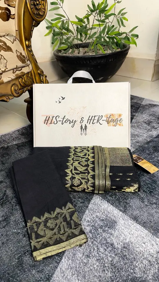 Crafted for a bold yet refined Eid festive look, this Dhakai Jamdani saree is handwoven with fine 80 count cotton yarn, offering a light, breathable and comfortable drape, designed to make a timeless statement during the festive season. The deep midnight black base creates a striking and graceful presence.